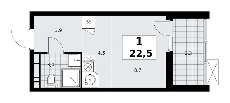 Площадь (общ/жил/кух), м2: 22.2/—/4.6