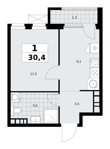 Площадь (общ/жил/кух), м2: 30.4/—/9.1