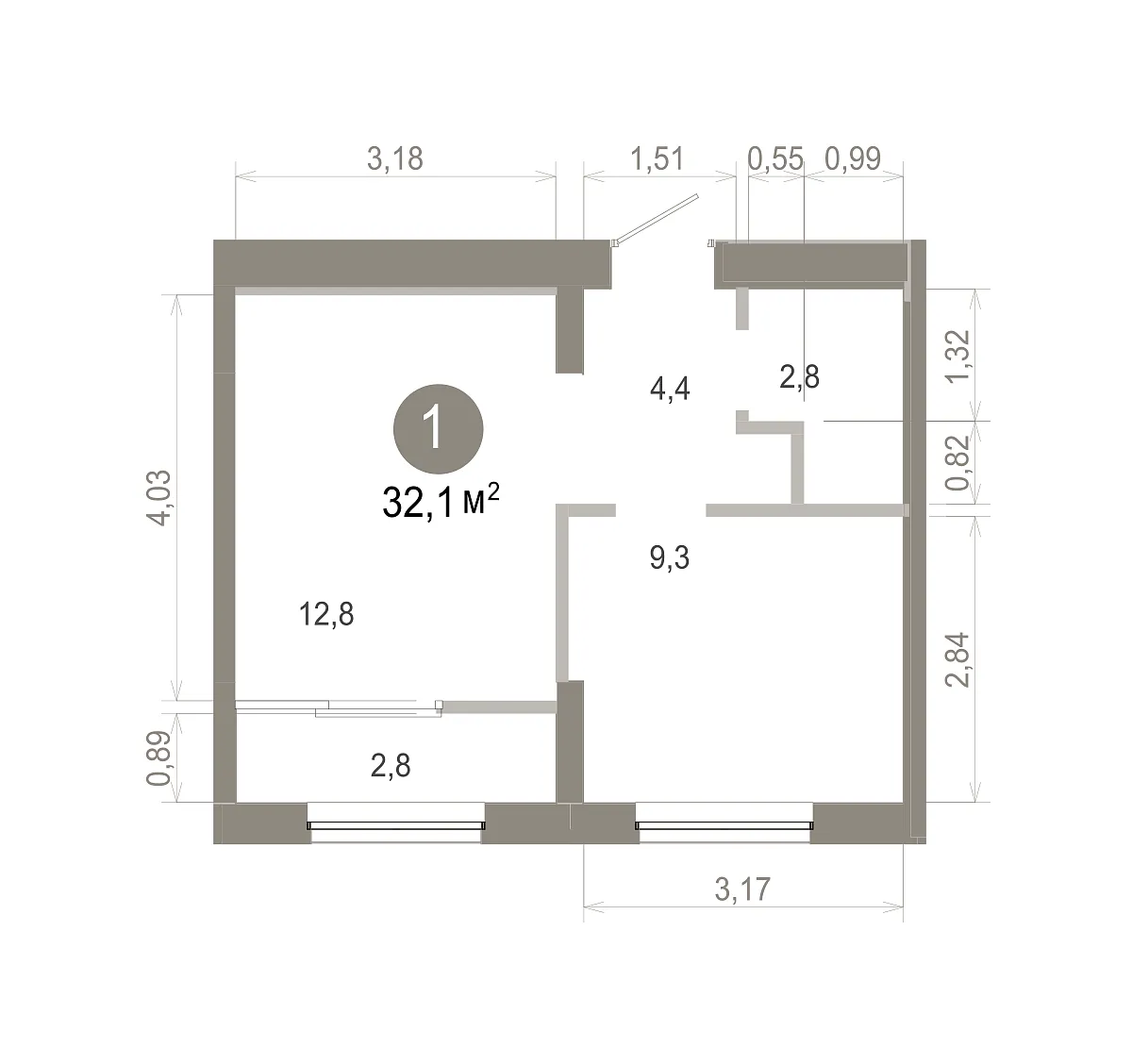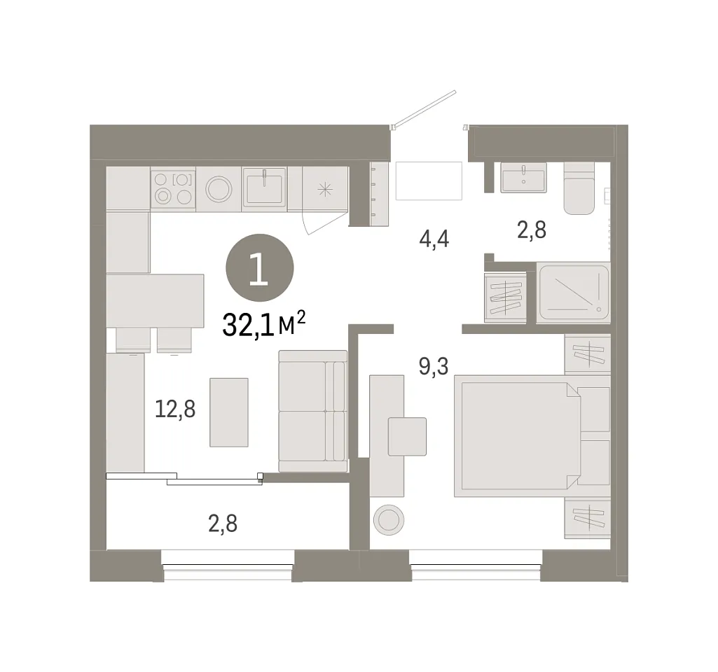 Площадь (общ/жил/кух), м2: 32.07/9.26/12.8