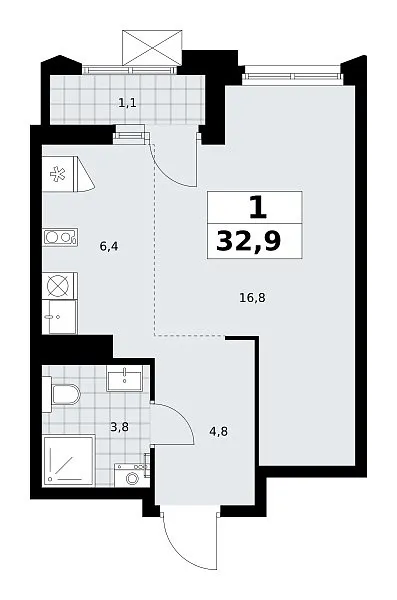 Площадь (общ/жил/кух), м2: 32.9/—/6.4