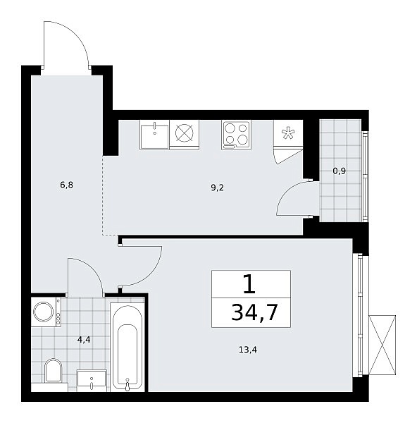 Площадь (общ/жил/кух), м2: 34.5/—/11