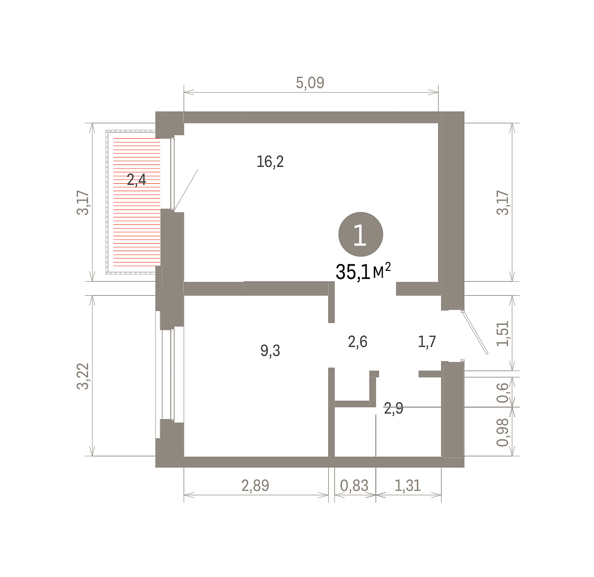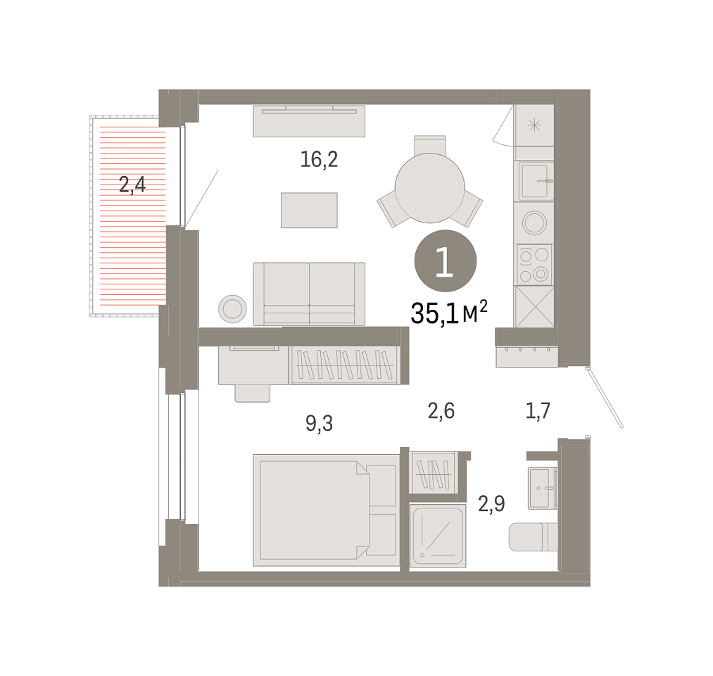 Площадь (общ/жил/кух), м2: 35.6/9.4/16.4