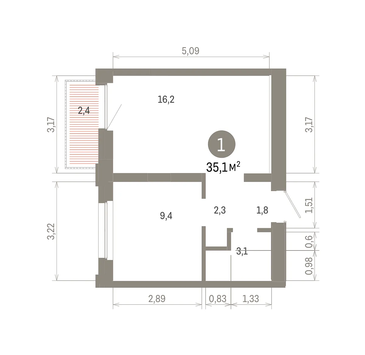 Площадь (общ/жил/кух), м2: 38.81/26.29/5.13