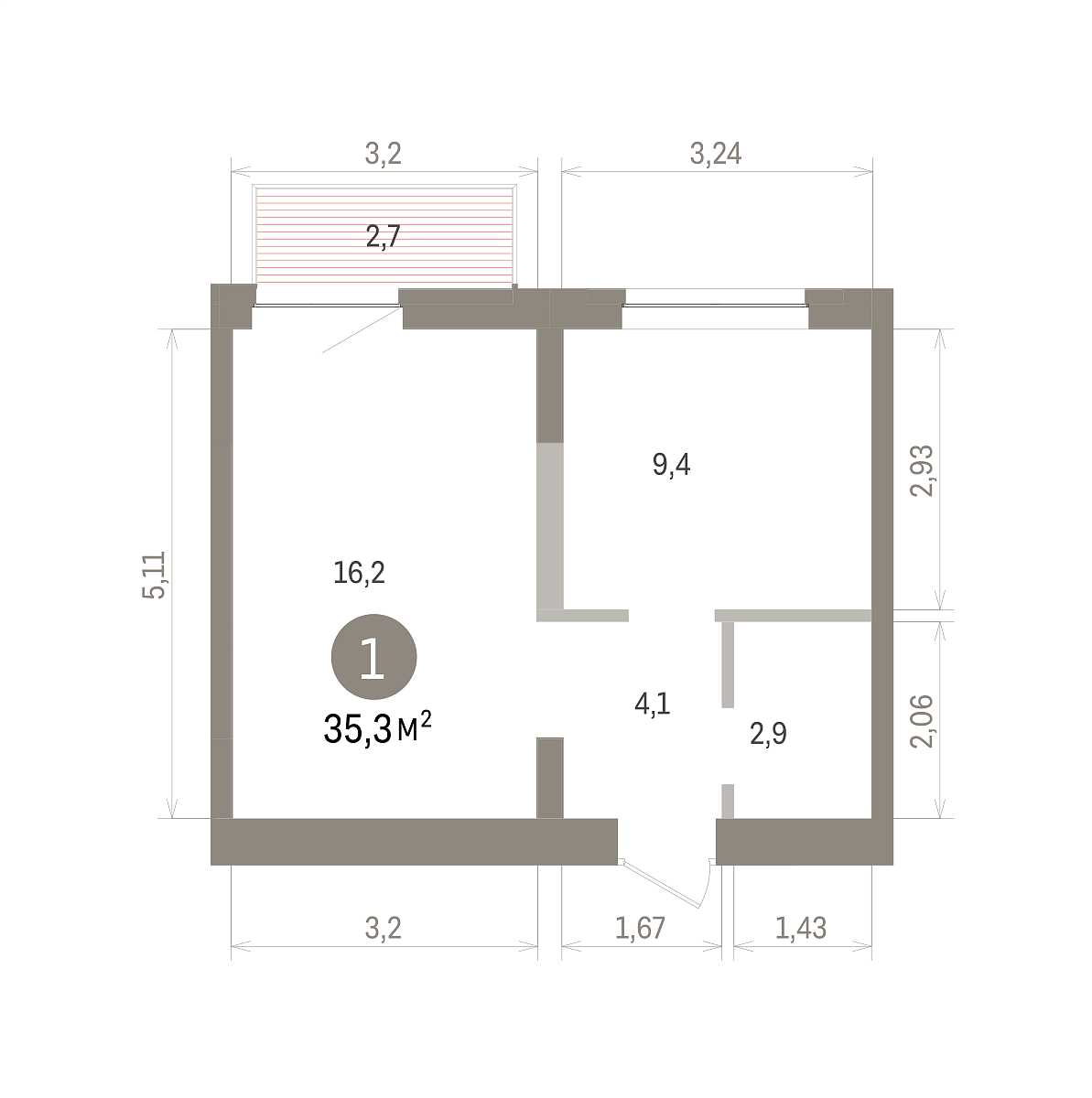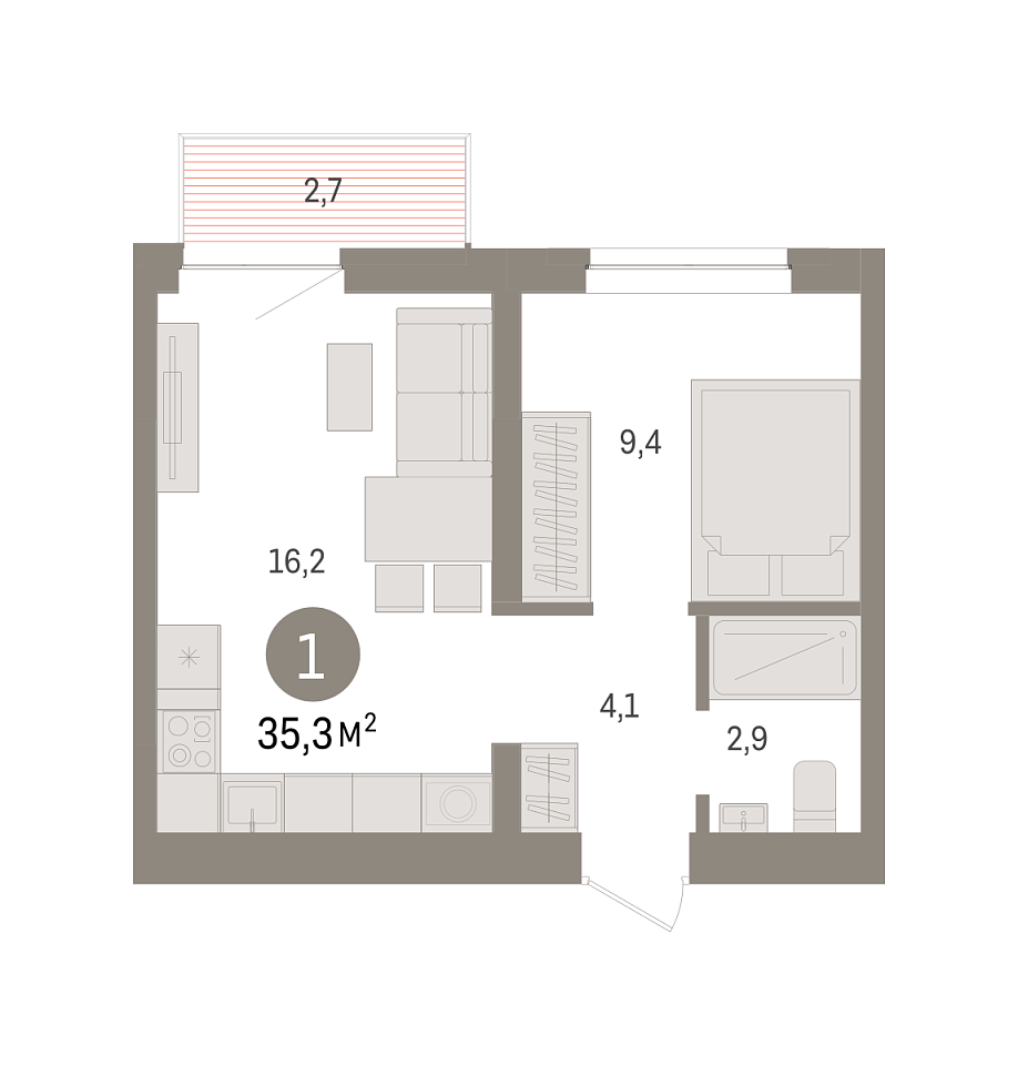 Общая площадь 35.3 м2