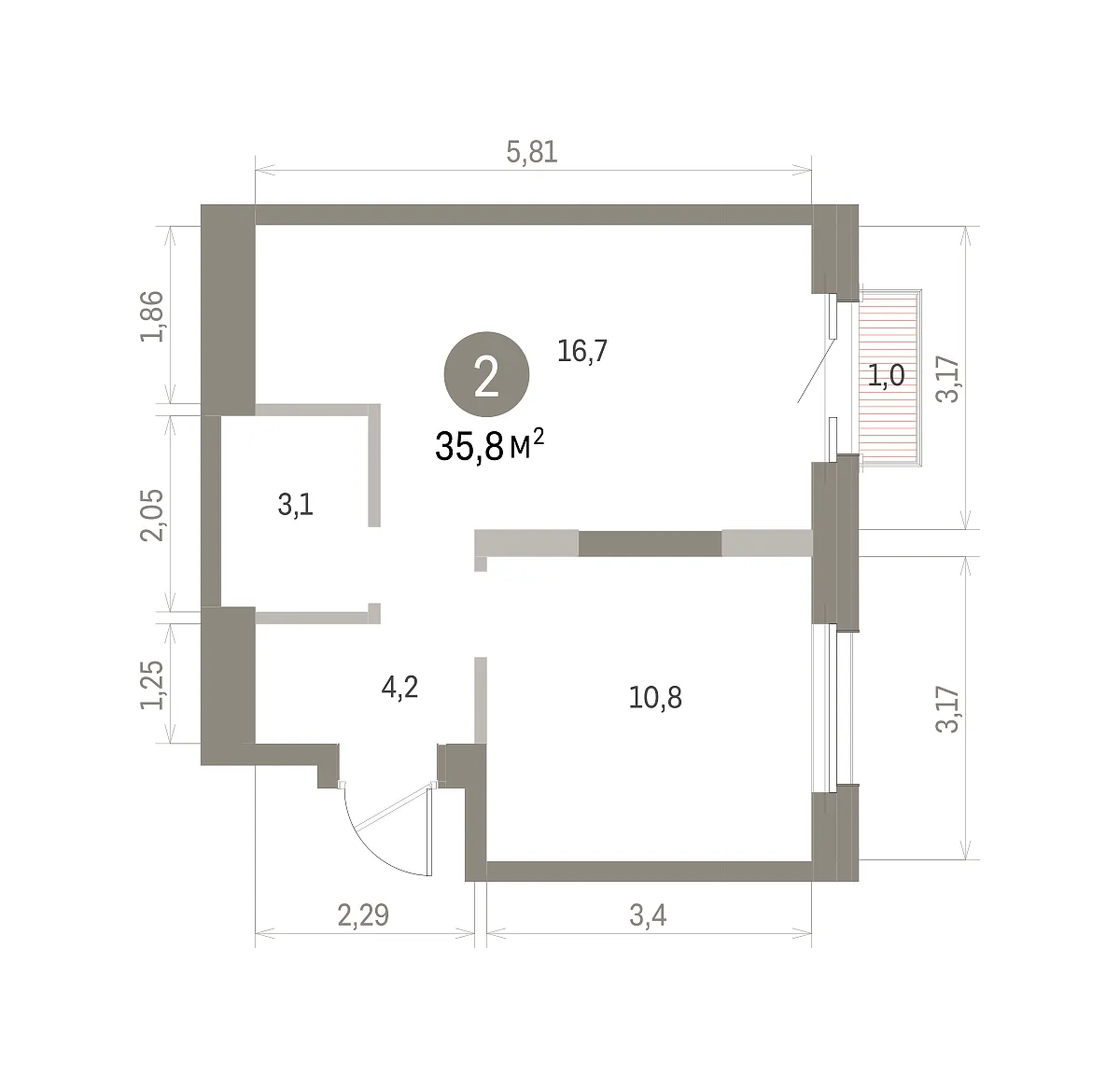 Общая площадь 35.8 м2