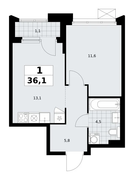 Площадь (общ/жил/кух), м2: 36.1/—/13.1