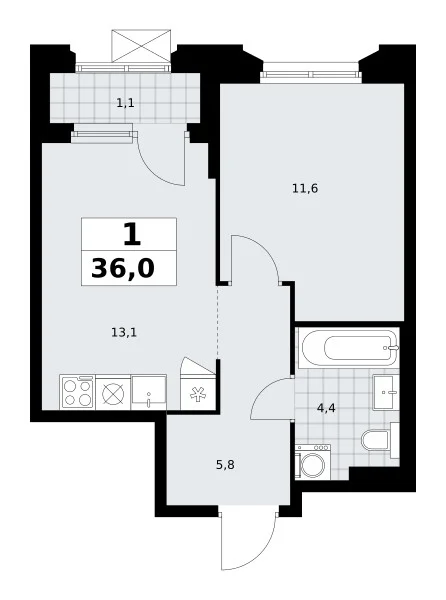 Площадь (общ/жил/кух), м2: 36.1/—/13.1
