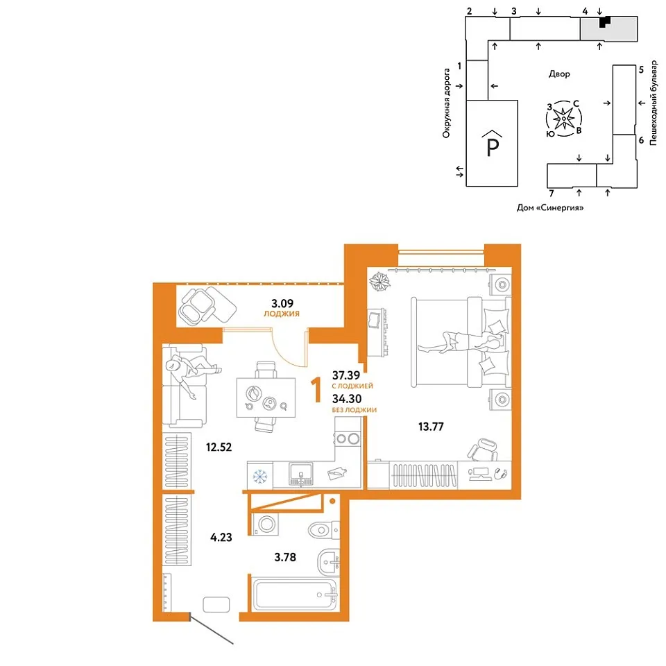 Площадь (общ/жил/кух), м2: 34.19/34.19/7.9