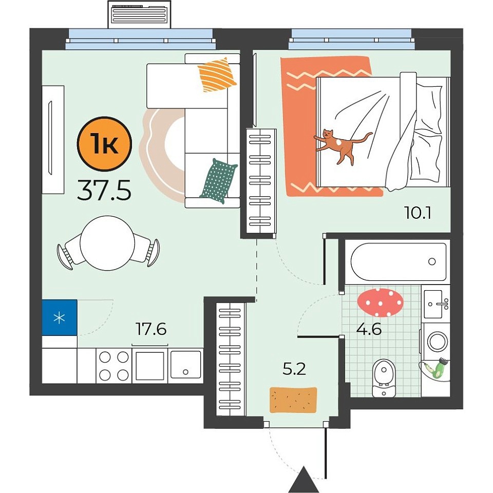 Количество комнат: 1, 37.5 кв.м.