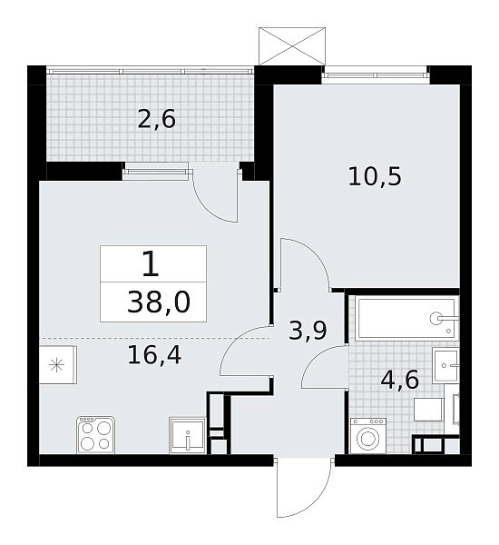 Площадь (общ/жил/кух), м2: 38.81/26.29/5.13