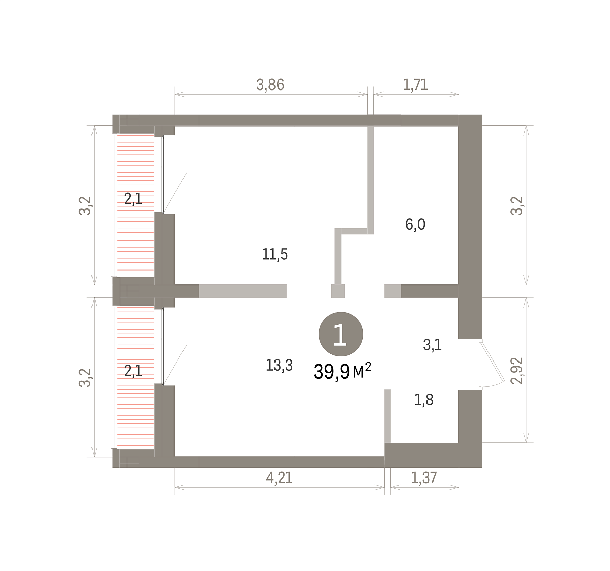 Общая площадь 39.9 м2