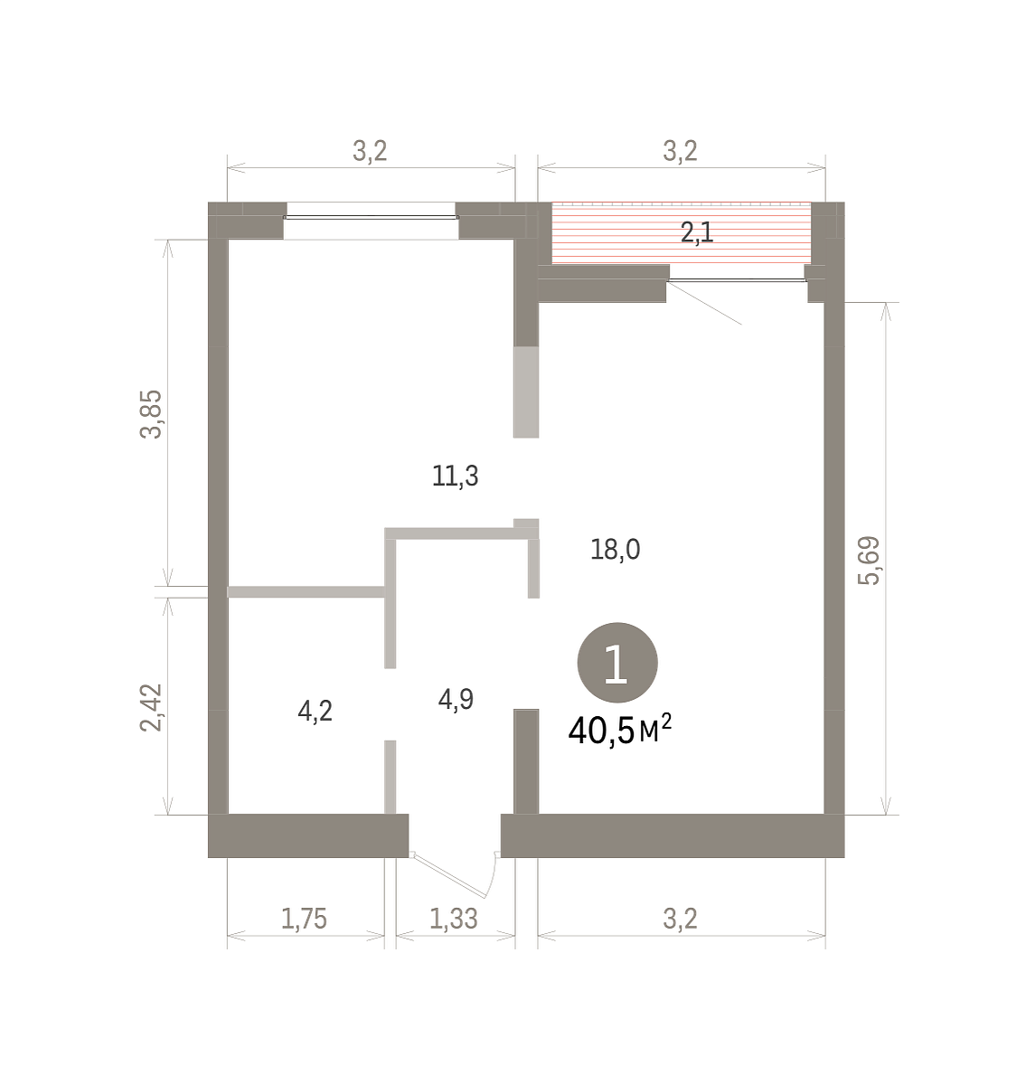 Общая площадь 40.5 м2