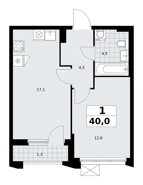 Площадь (общ/жил/кух), м2: 40/—/17.1
