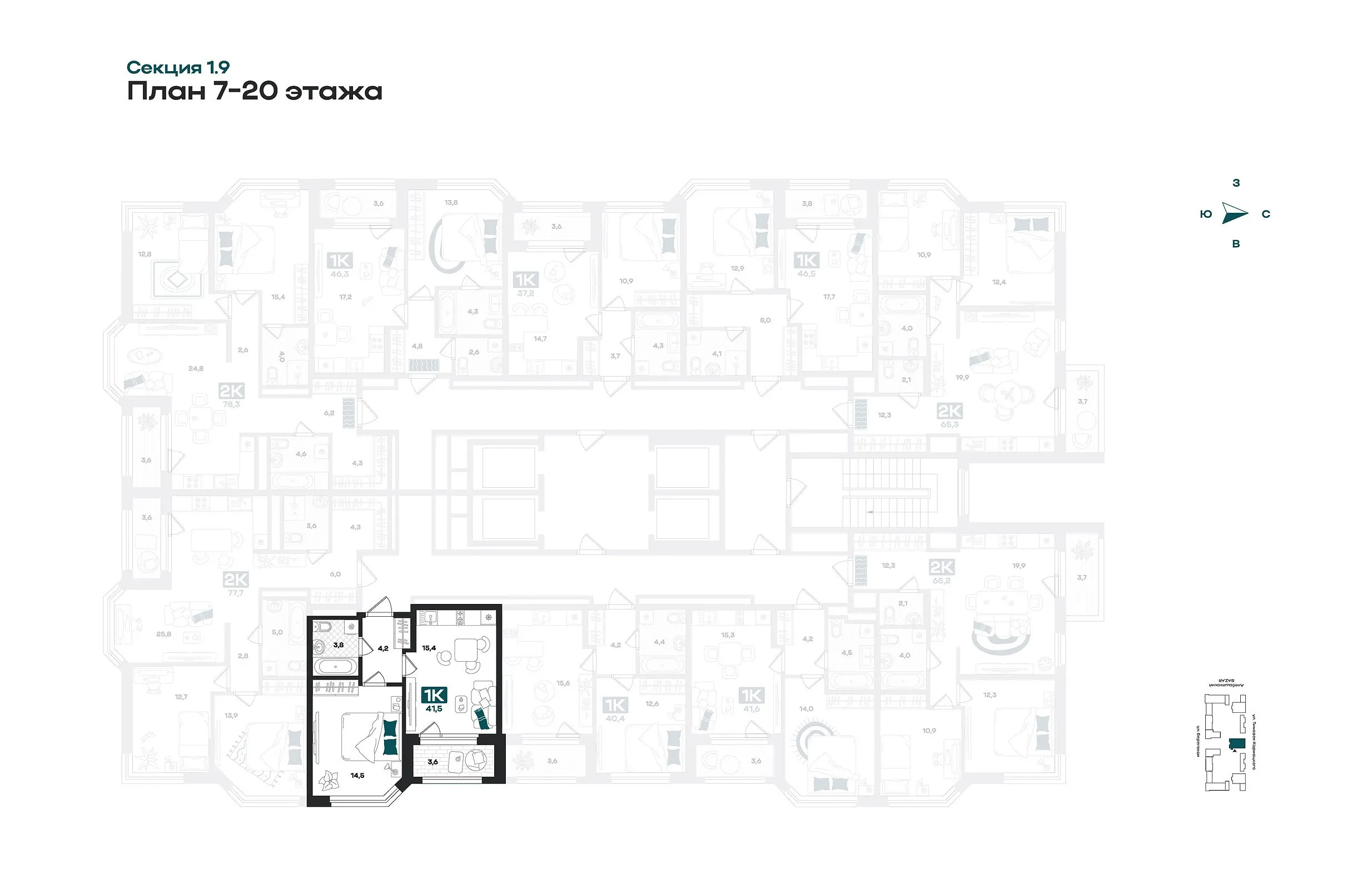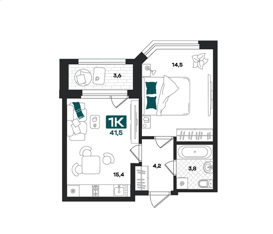 Общая площадь 41.5 м2