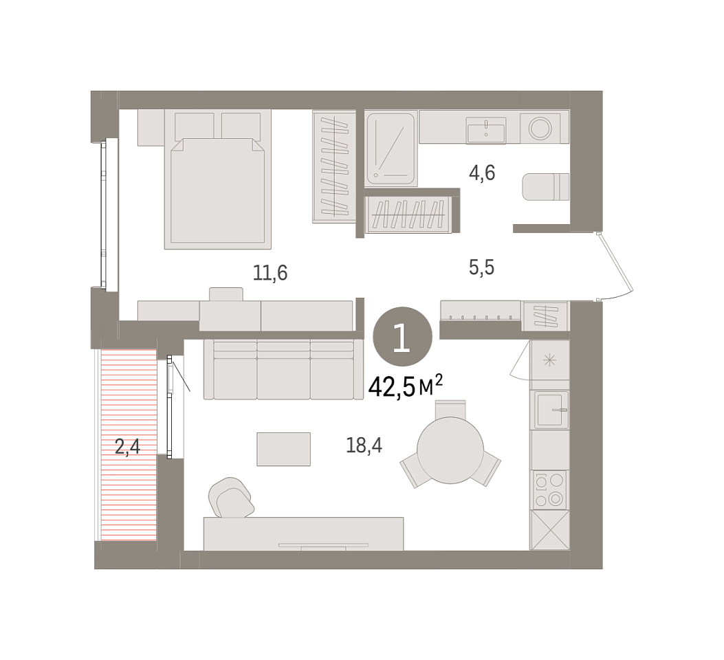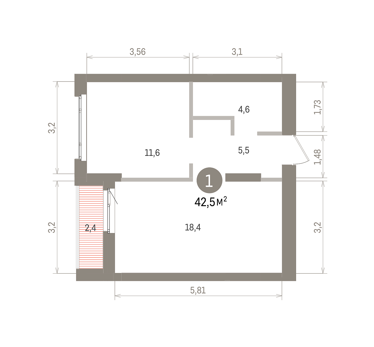 Площадь (общ/жил/кух), м2: 42.5/11.6/18.4