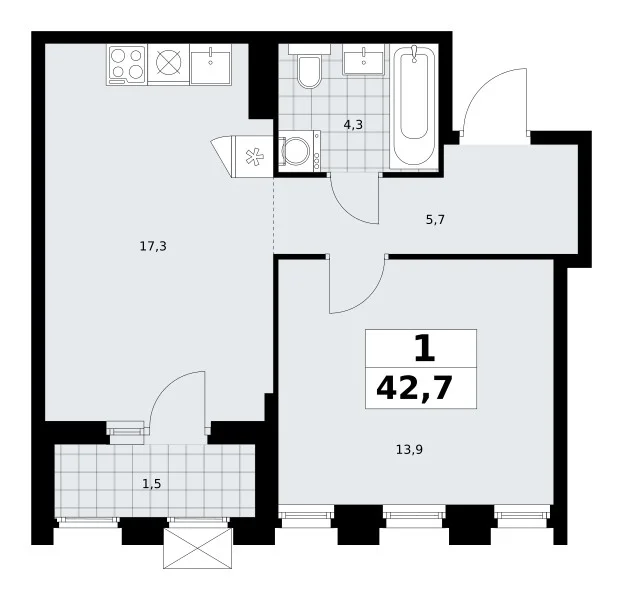 Количество комнат: 1, 42.7 кв.м.