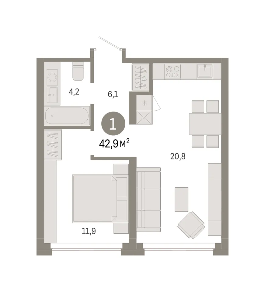 Количество комнат: 1, 42.86 кв.м.