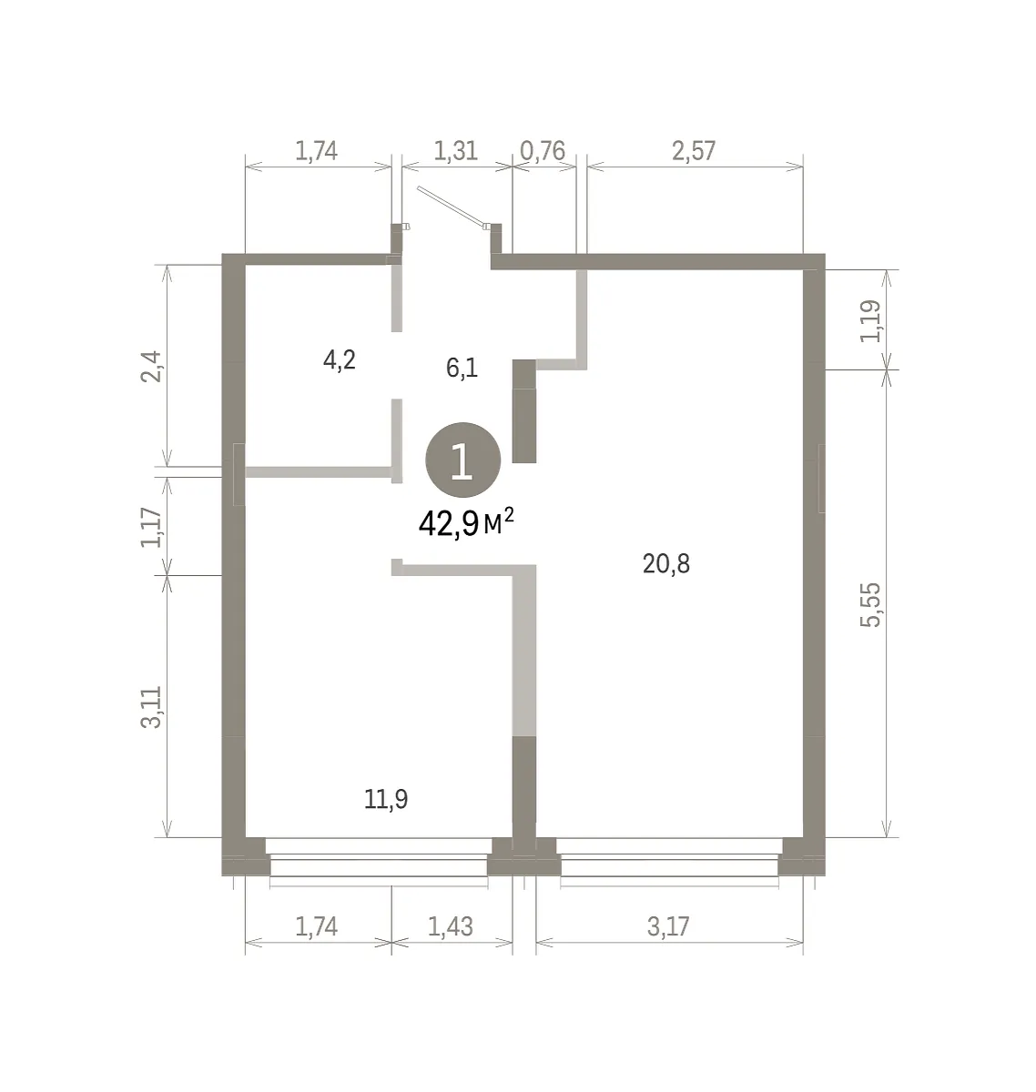 Общая площадь 42.86 м2