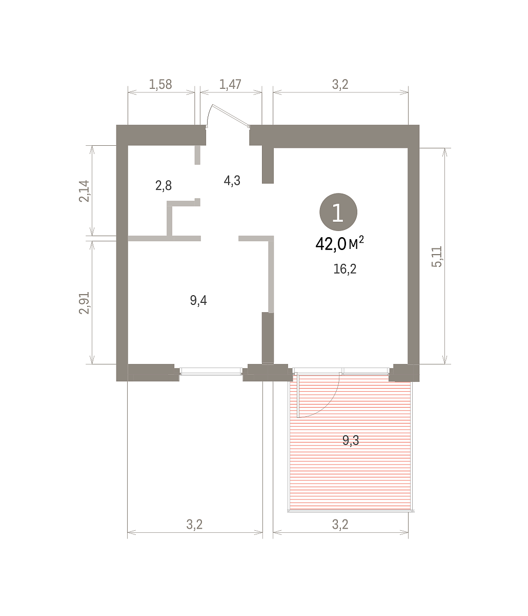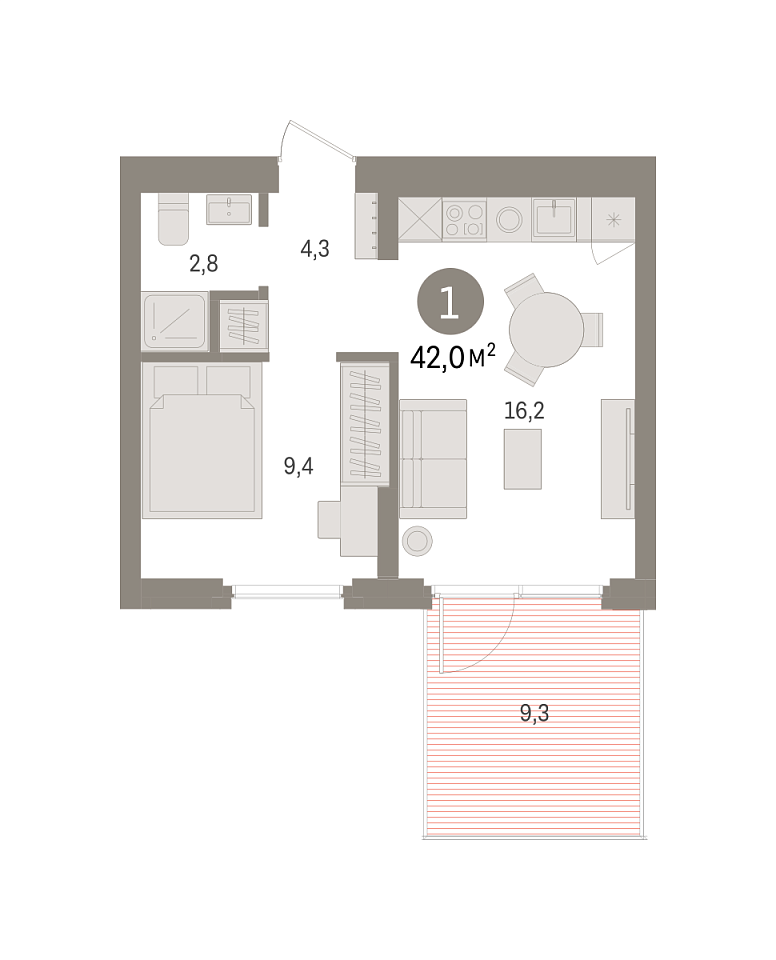 Общая площадь 42 м2