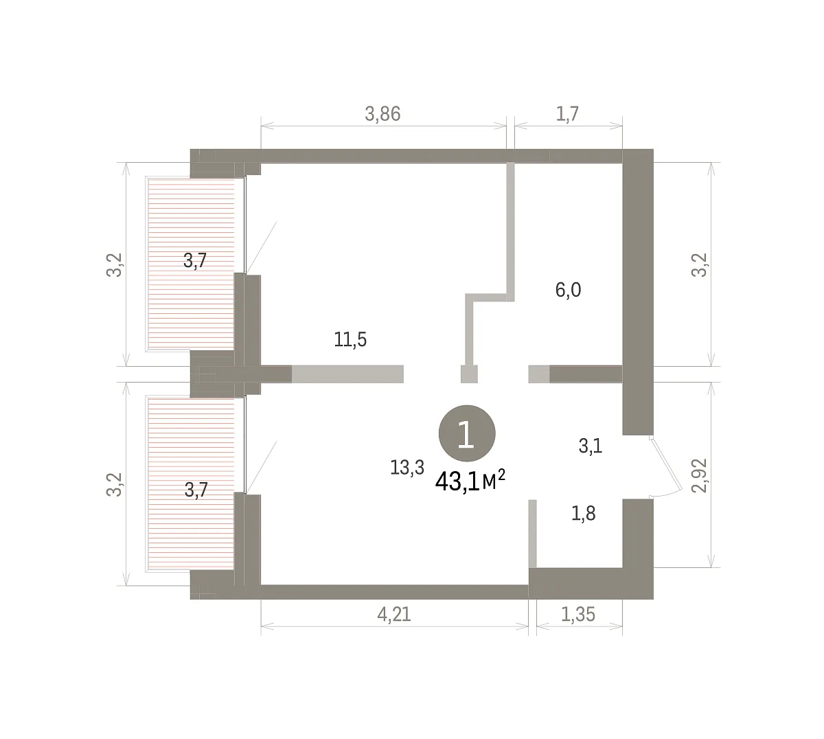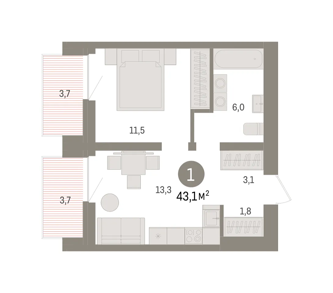 Площадь (общ/жил/кух), м2: 43.1/11.5/13.3