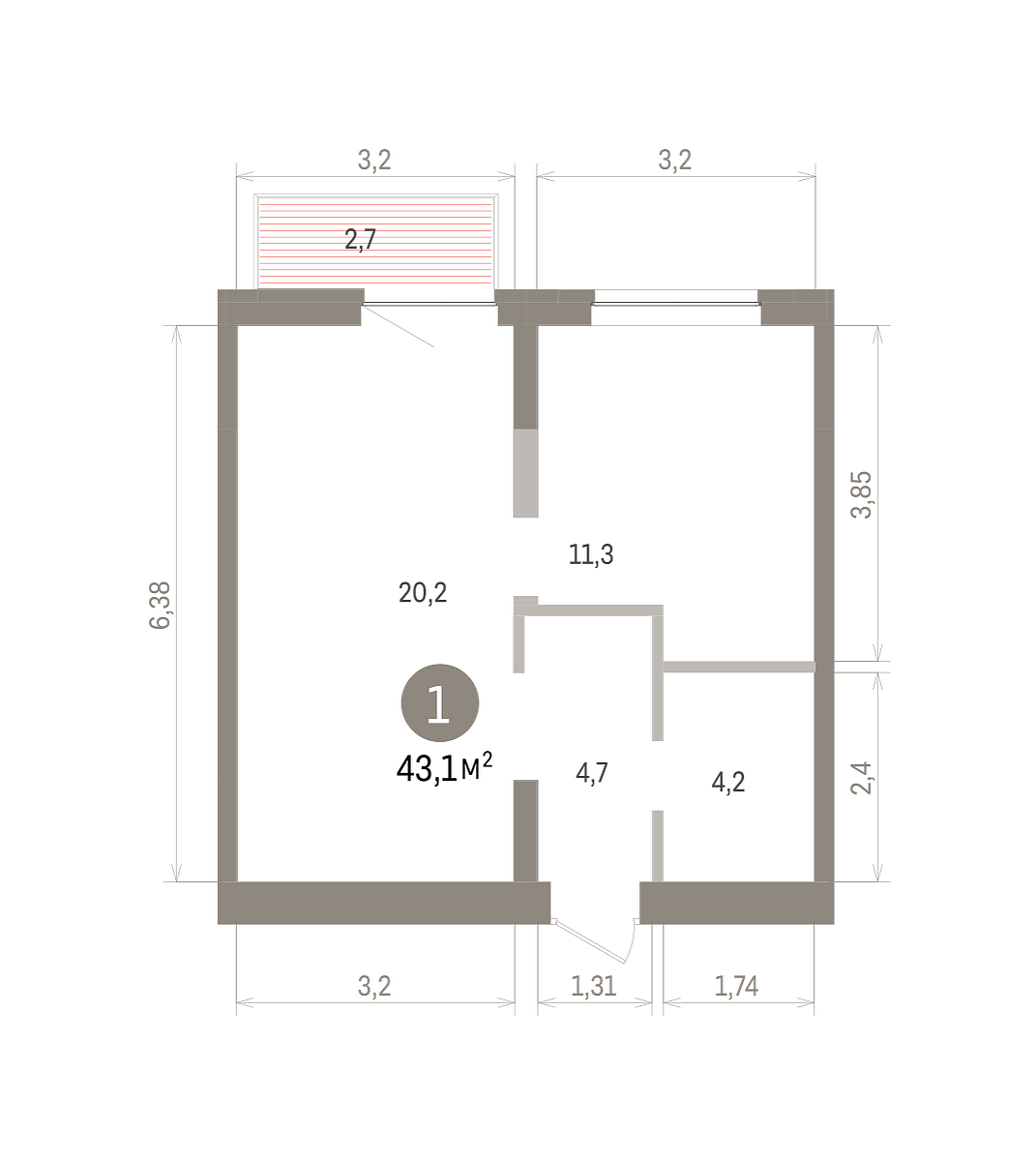 Общая площадь 43.1 м2