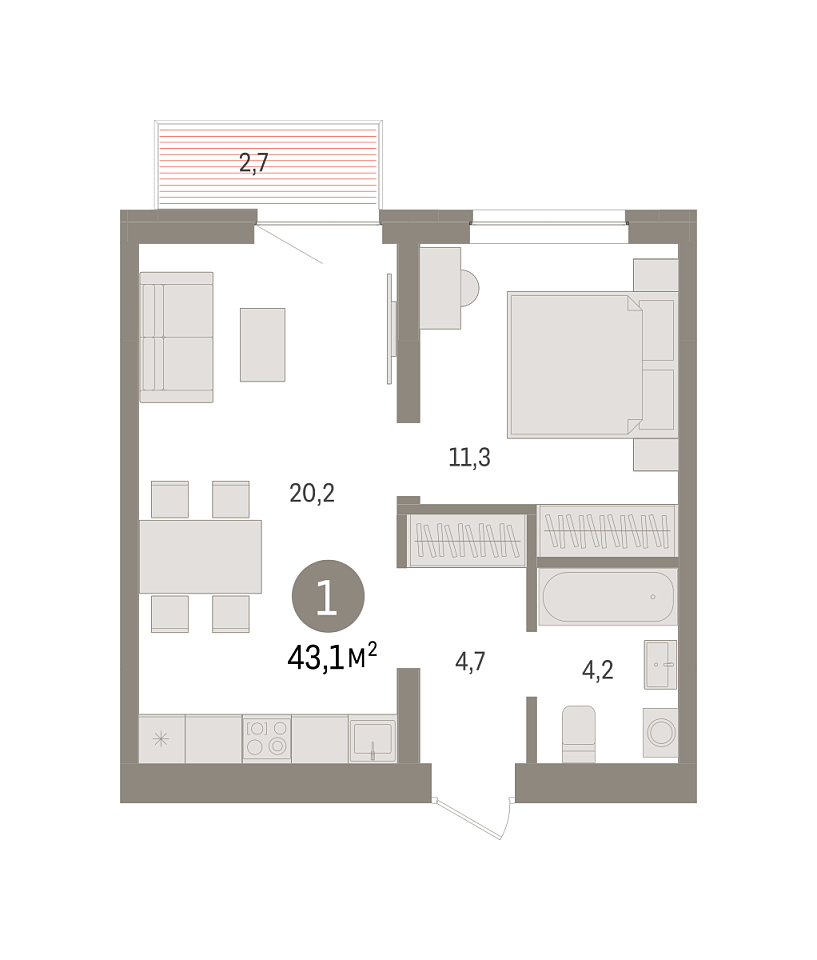 Количество комнат: 1, 43.1 кв.м.