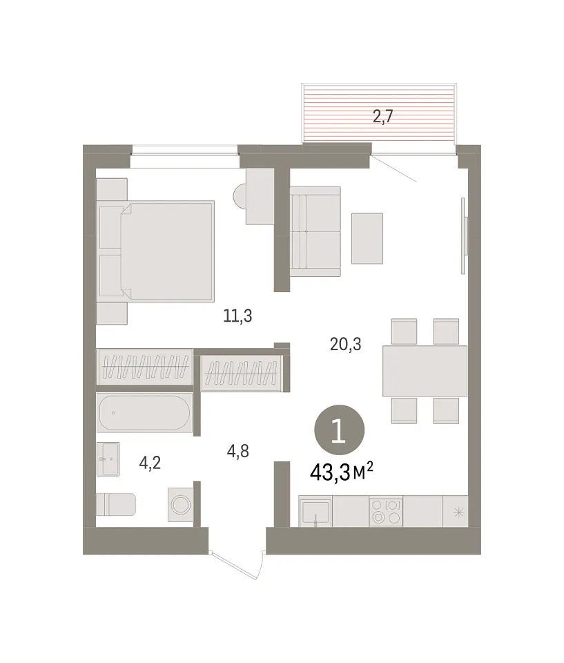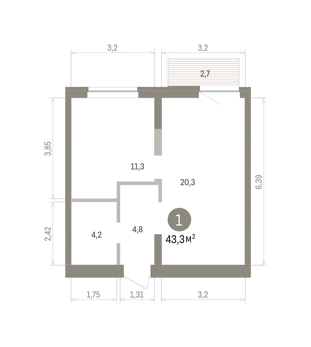 Площадь (общ/жил/кух), м2: 43.3/11.3/20.2