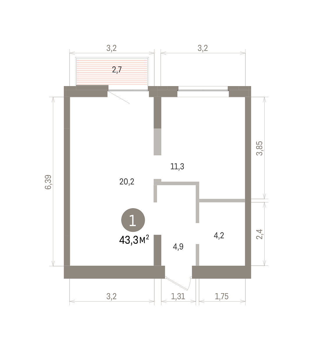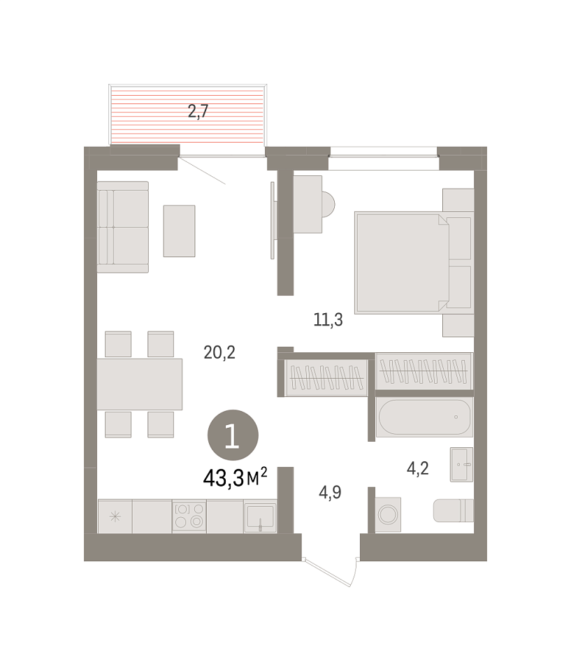 Площадь (общ/жил/кух), м2: 43.1/11.3/20.2