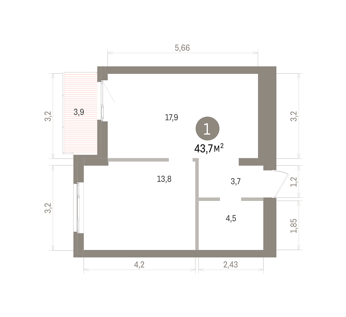 Площадь (общ/жил/кух), м2: 39.43/22.66/5.59