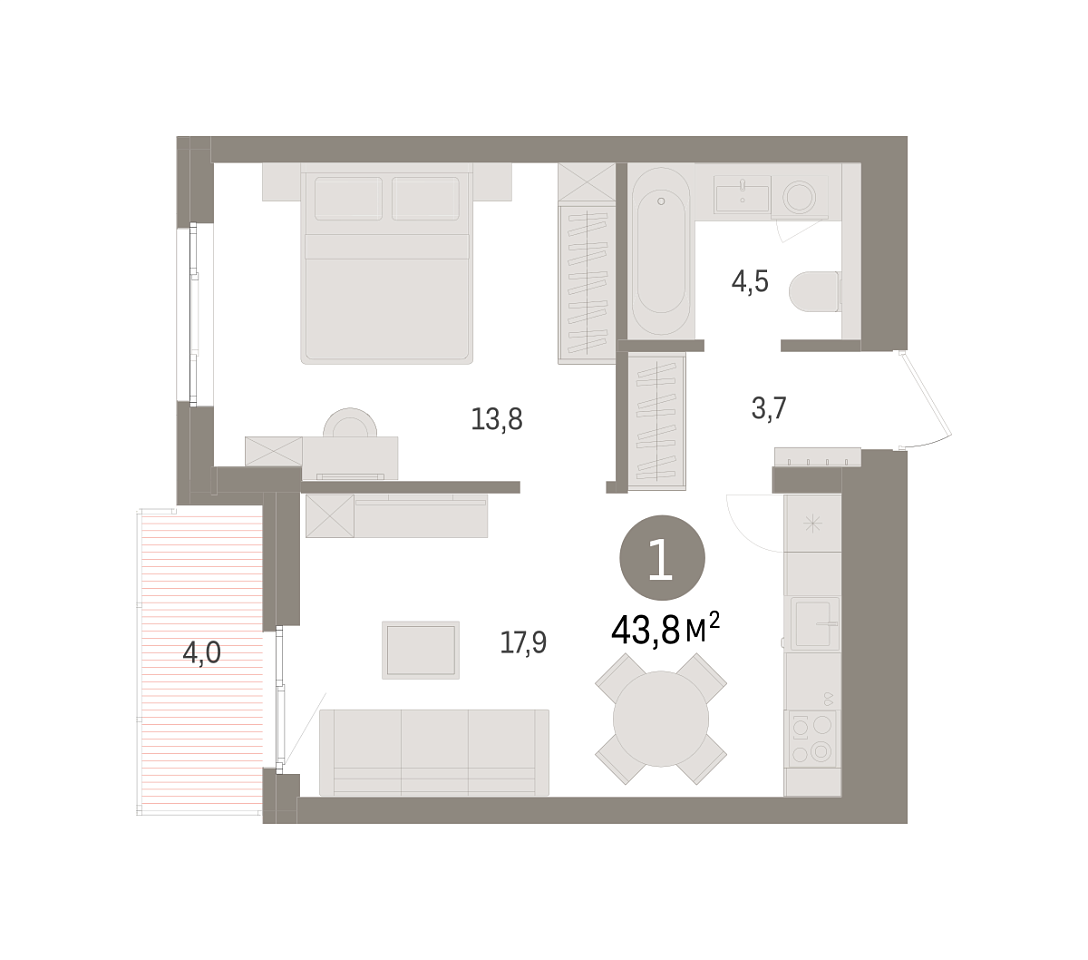 Количество комнат: 1, 43.83 кв.м.