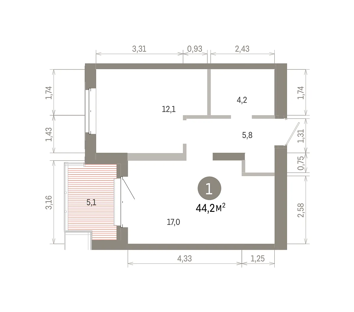 Площадь (общ/жил/кух), м2: 42.38/13.41/17.71