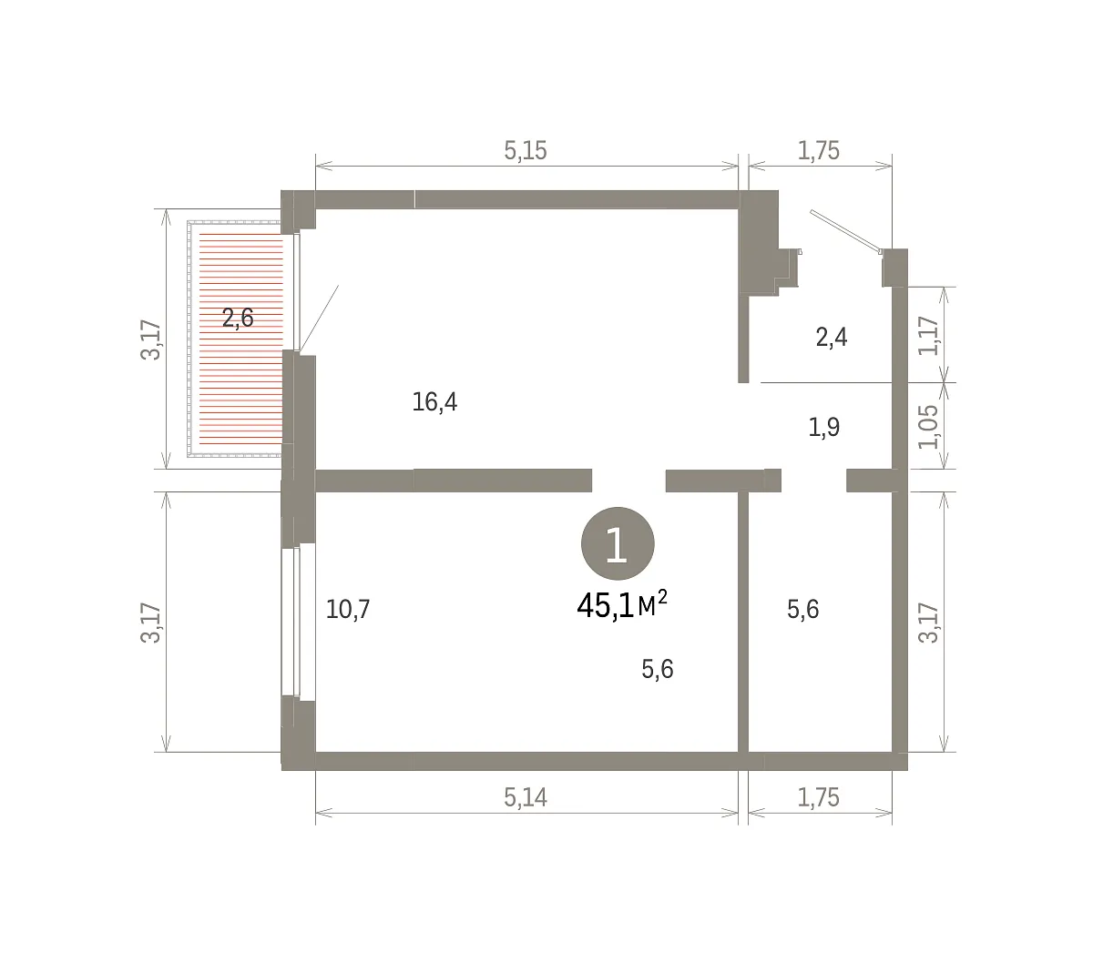 Площадь (общ/жил/кух), м2: 45.05/45.05/4.98