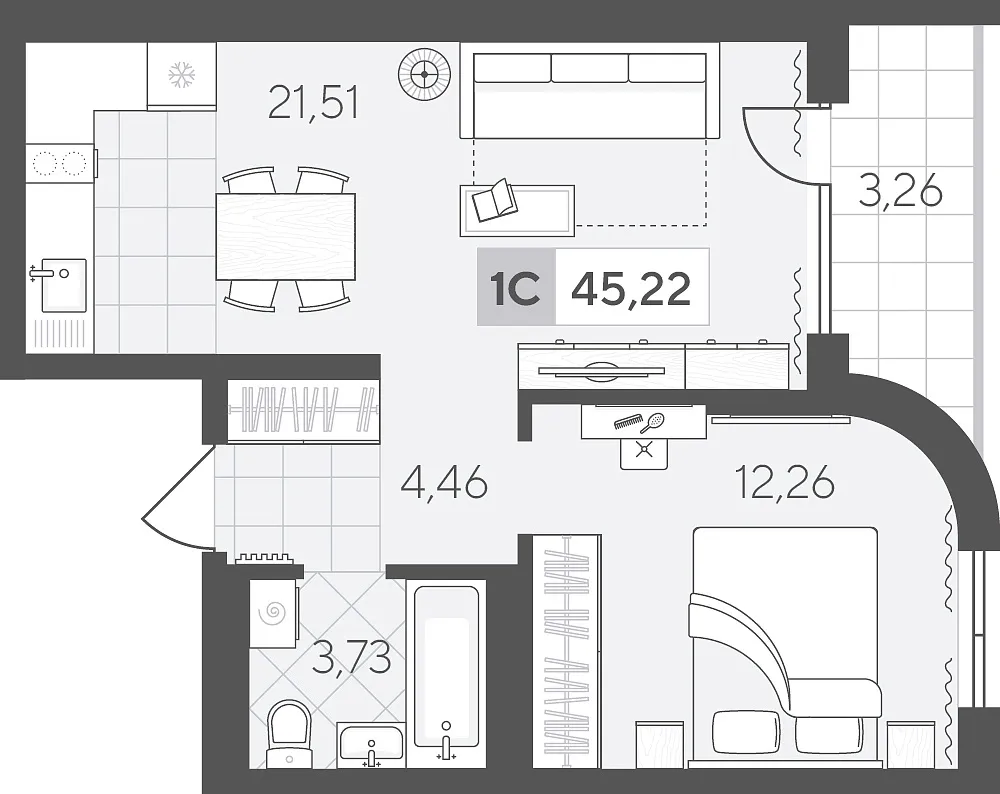 Количество комнат: 1, 45.22 кв.м.