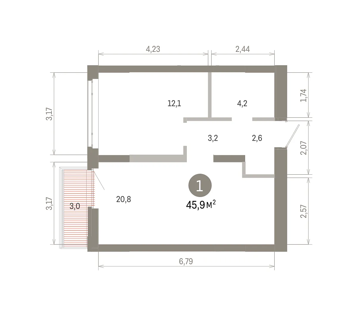 Площадь (общ/жил/кух), м2: 45.89/12.06/20.78