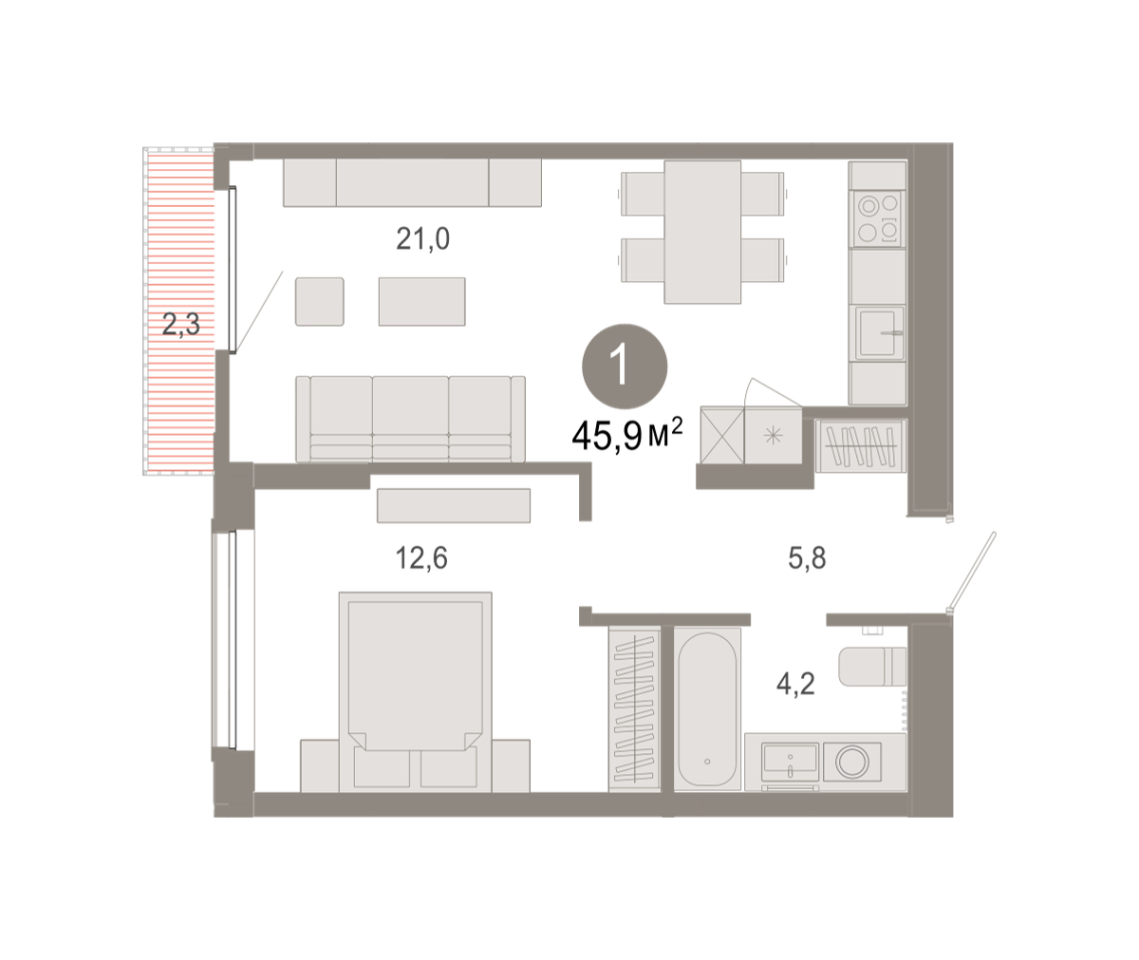 Площадь (общ/жил/кух), м2: 45.93/12.63/21.01