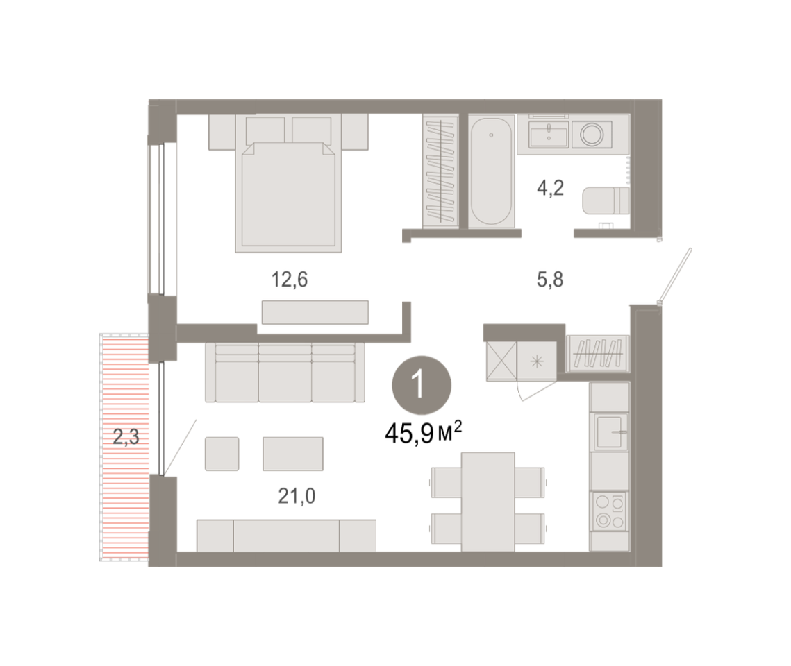 Площадь (общ/жил/кух), м2: 45.93/12.63/21.01
