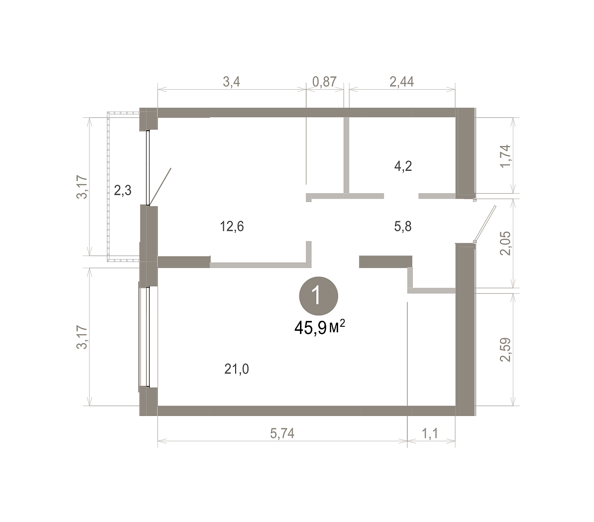 Площадь (общ/жил/кух), м2: 45.93/12.63/21.01