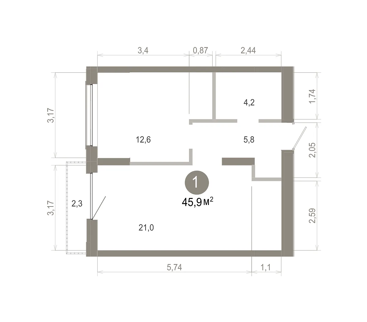 Площадь (общ/жил/кух), м2: 46.07/12.71/21.13