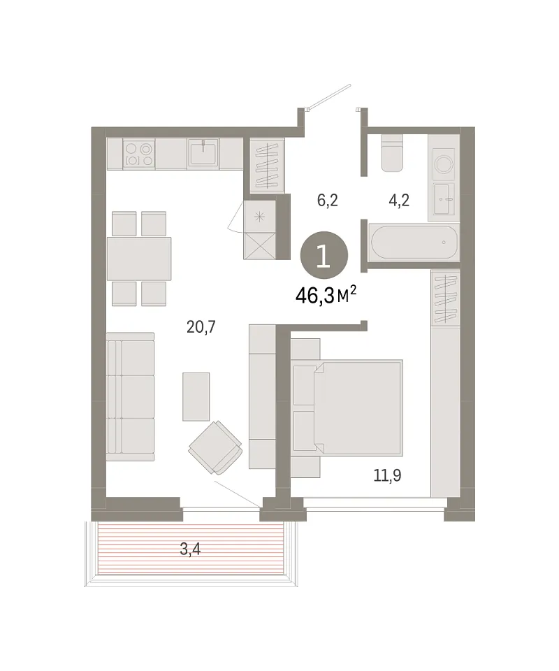 Количество комнат: 1, 46.28 кв.м.