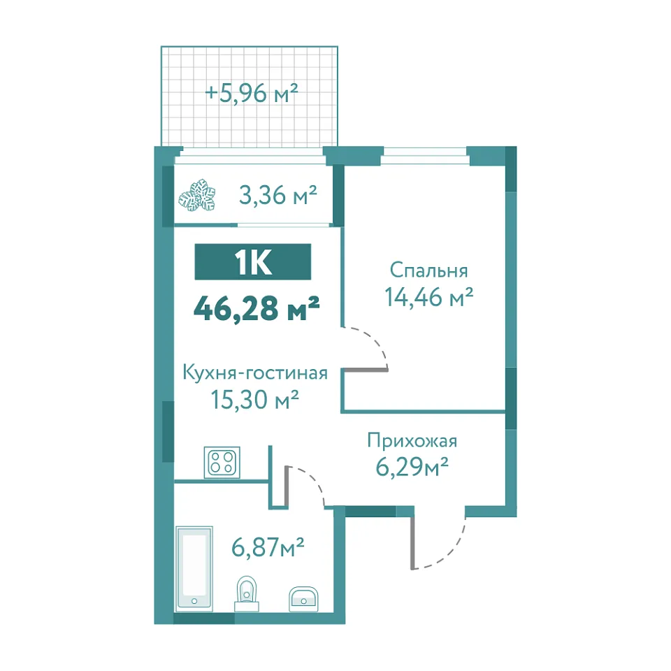 Количество комнат: 1, 46.28 кв.м.