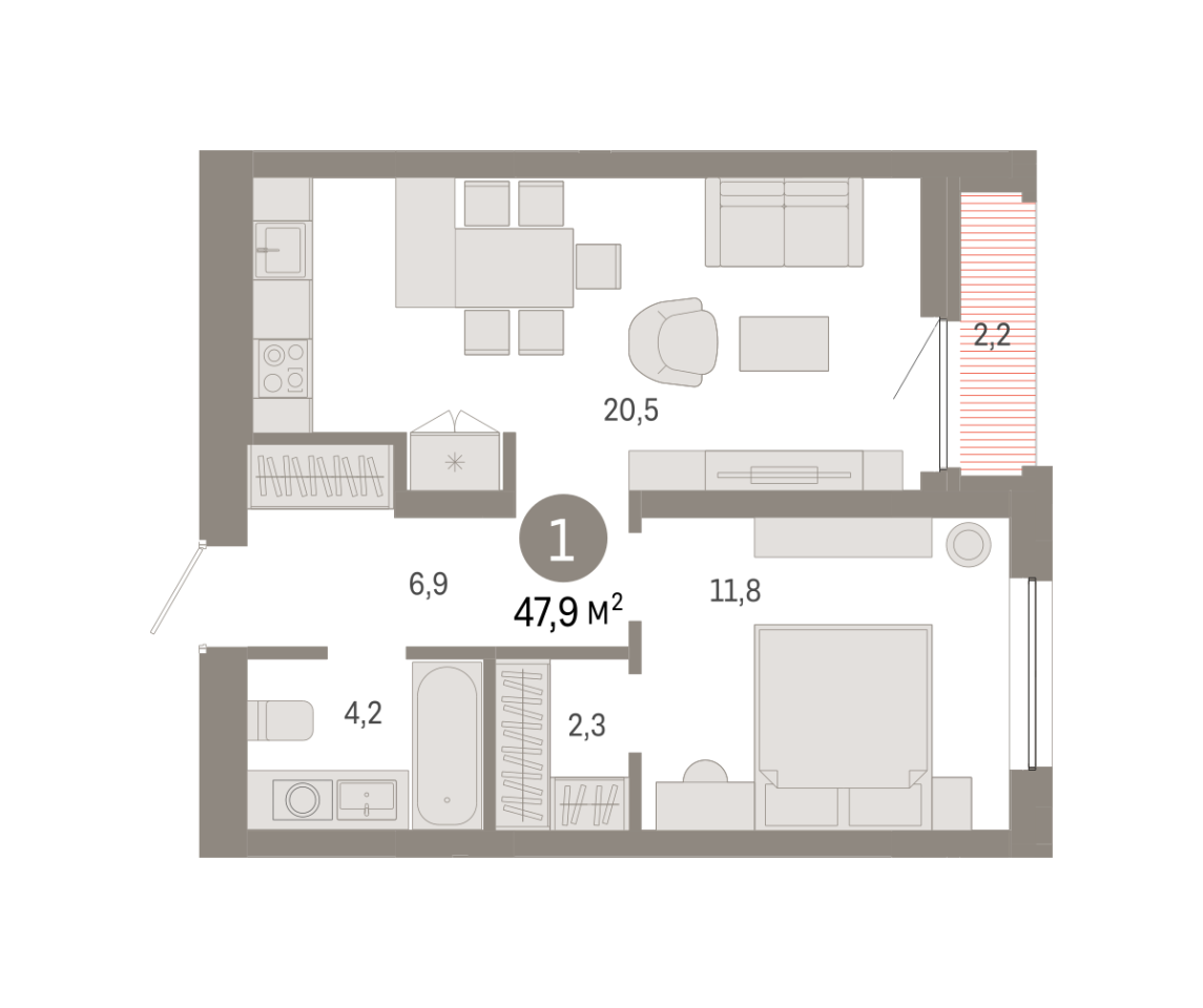 Количество комнат: 1, 47.93 кв.м.