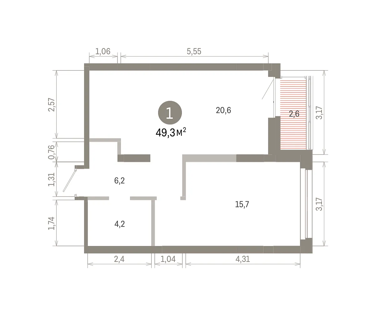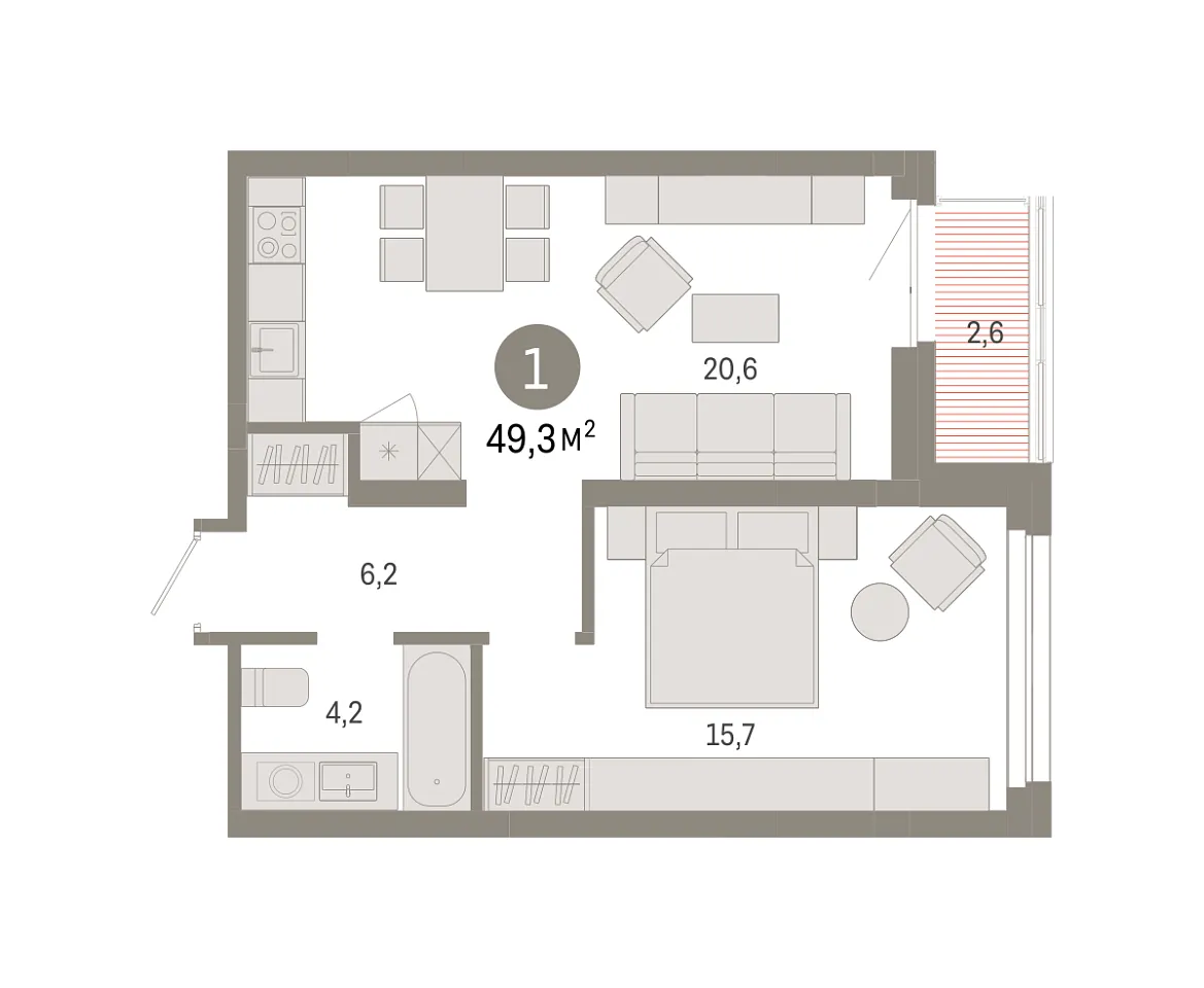 Количество комнат: 1, 49.3 кв.м.