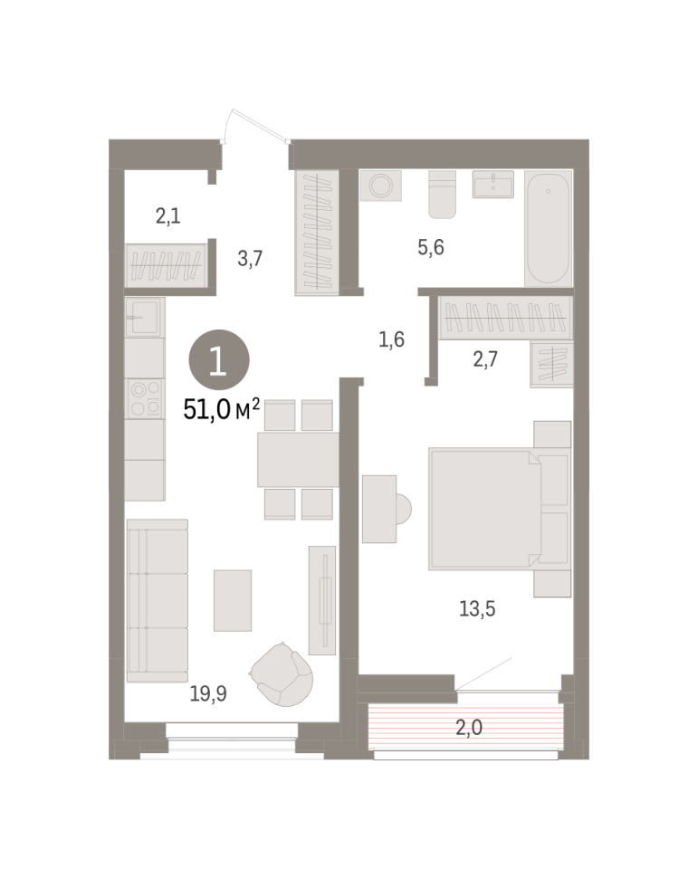 Площадь (общ/жил/кух), м2: 50.9/13.5/19.9
