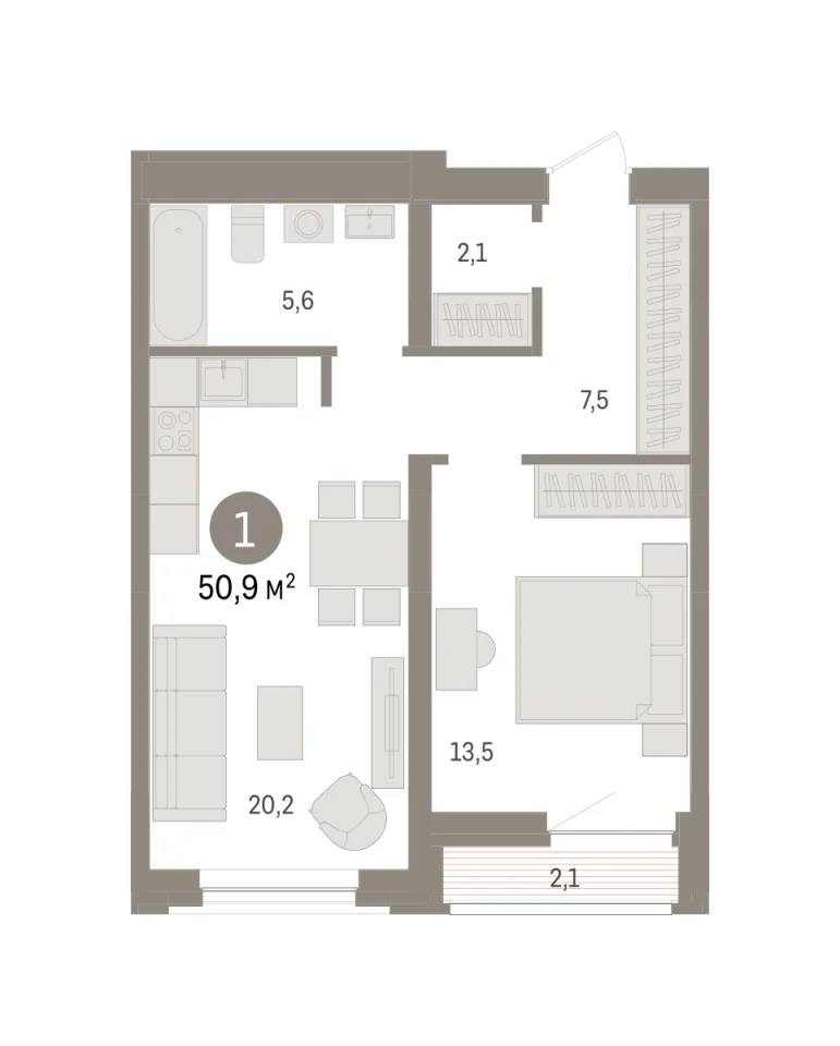 Площадь (общ/жил/кух), м2: 50.9/13.5/20.2