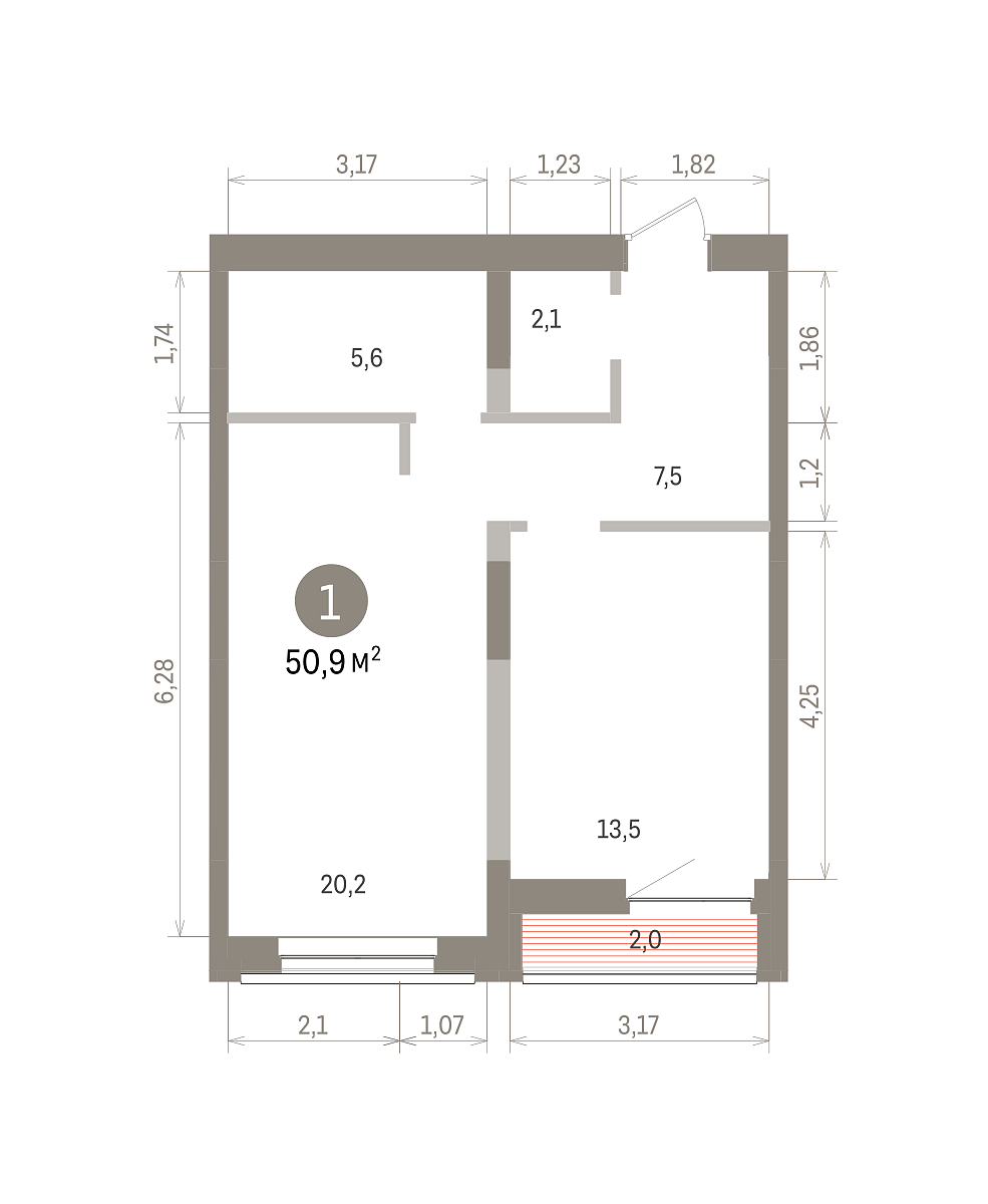 Площадь (общ/жил/кух), м2: 50.9/13.5/20.2