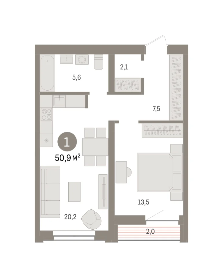 Количество комнат: 1, 50.9 кв.м.