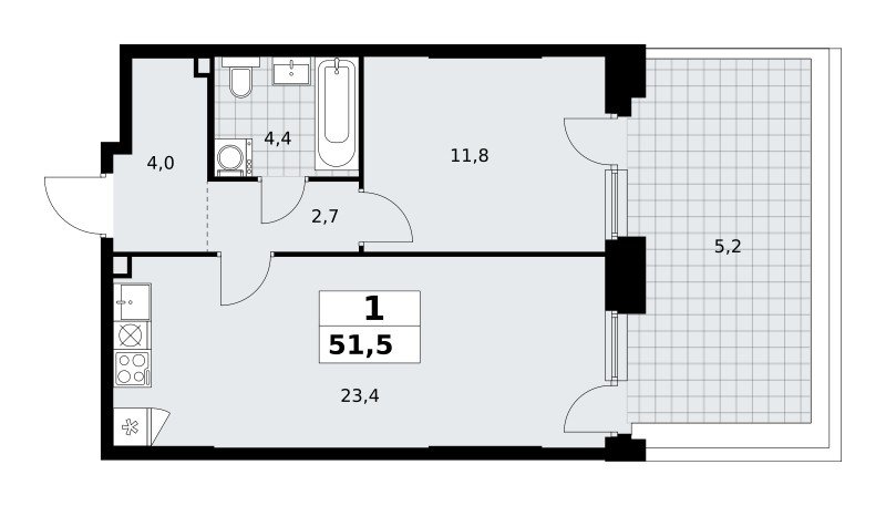 Количество комнат: 1, 51.5 кв.м.