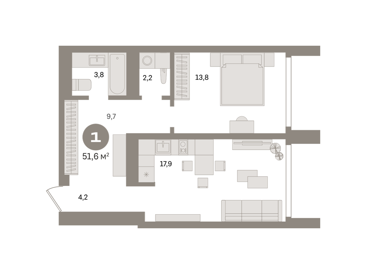 Площадь (общ/жил/кух), м2: 51.6/13.8/17.9