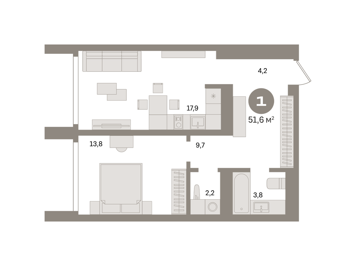 Площадь (общ/жил/кух), м2: 51.6/13.8/17.9