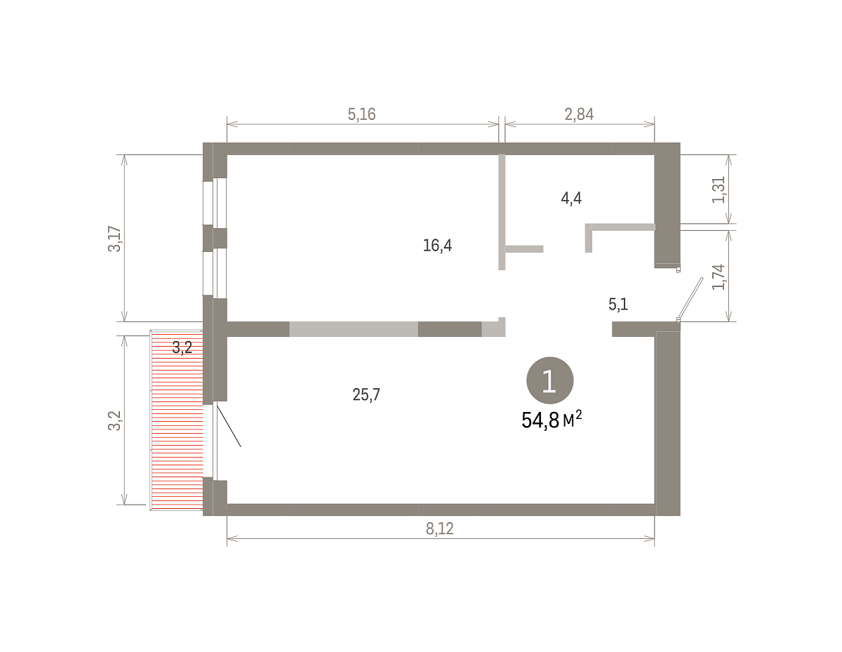 Общая площадь 54.77 м2